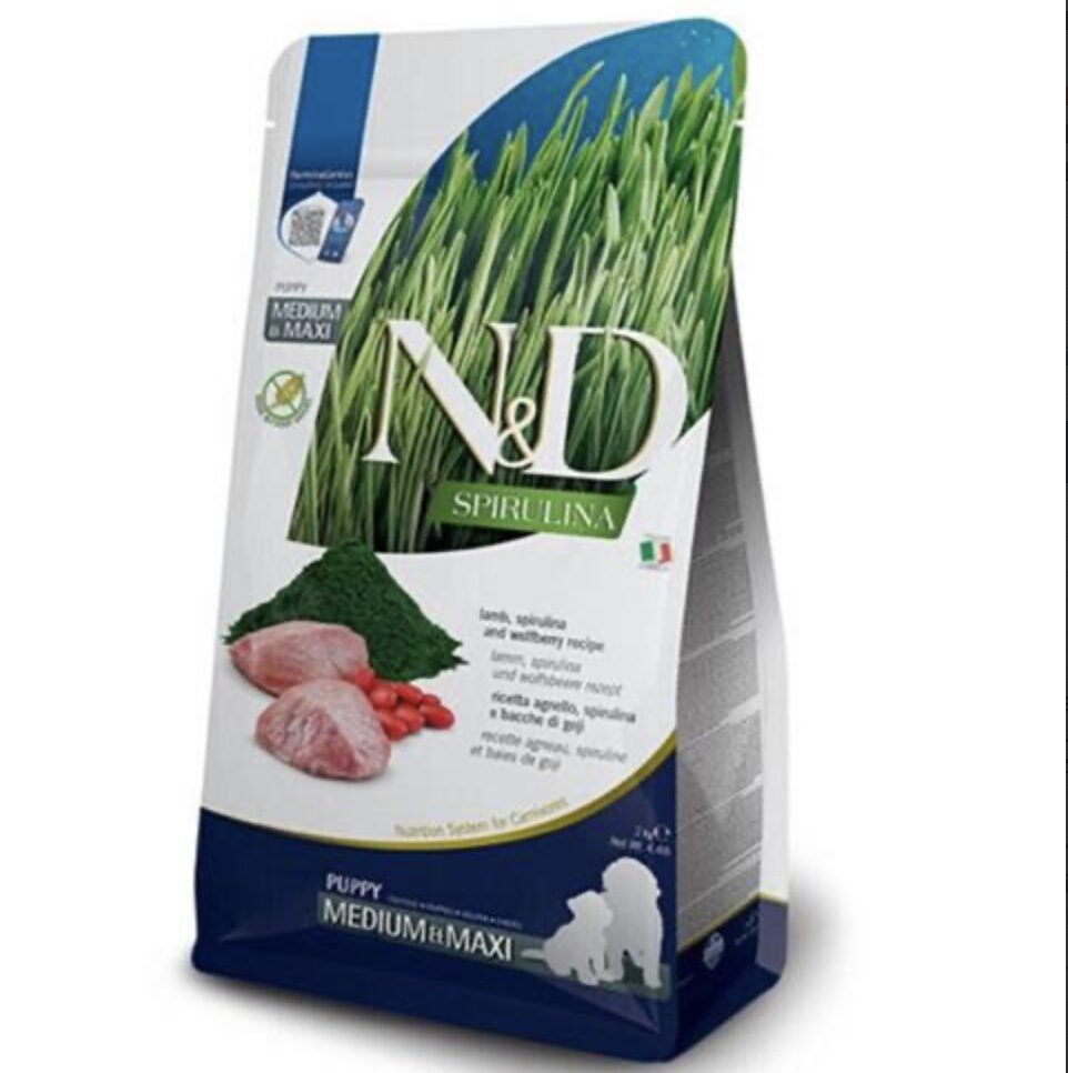 Kompletné krmivo pre šteňatá a gravidné alebo dojčiace suky s jahňacím mäsom, spirulinou a plodmi goji.