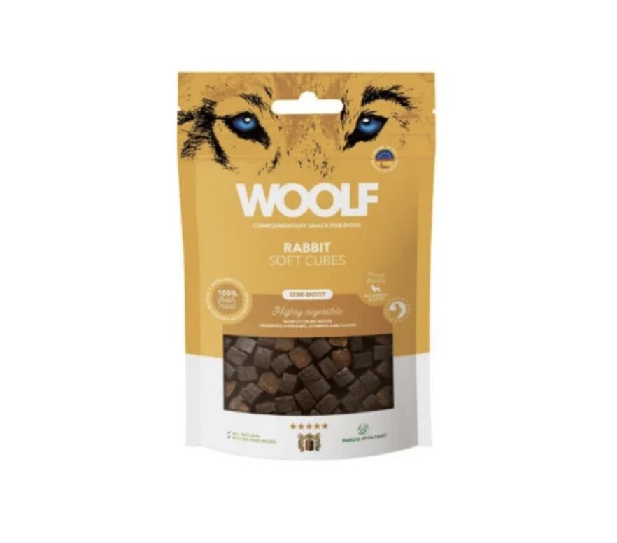 Voňavé mäkké kocky Woolf z čerstvého králičieho mäsa, vhodné pre psy všetkých plemien. Polomäkké kocky sú veľmi chutné, vysoko stráviteľné a neobsahujú obilniny. Skvelá pochúťka, ktorá poteší neskrotné mláďa a aj staršieho psa.